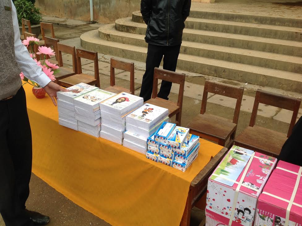Bút, vở được xếp ngay ngắn chuẩn bị tặng cho các em