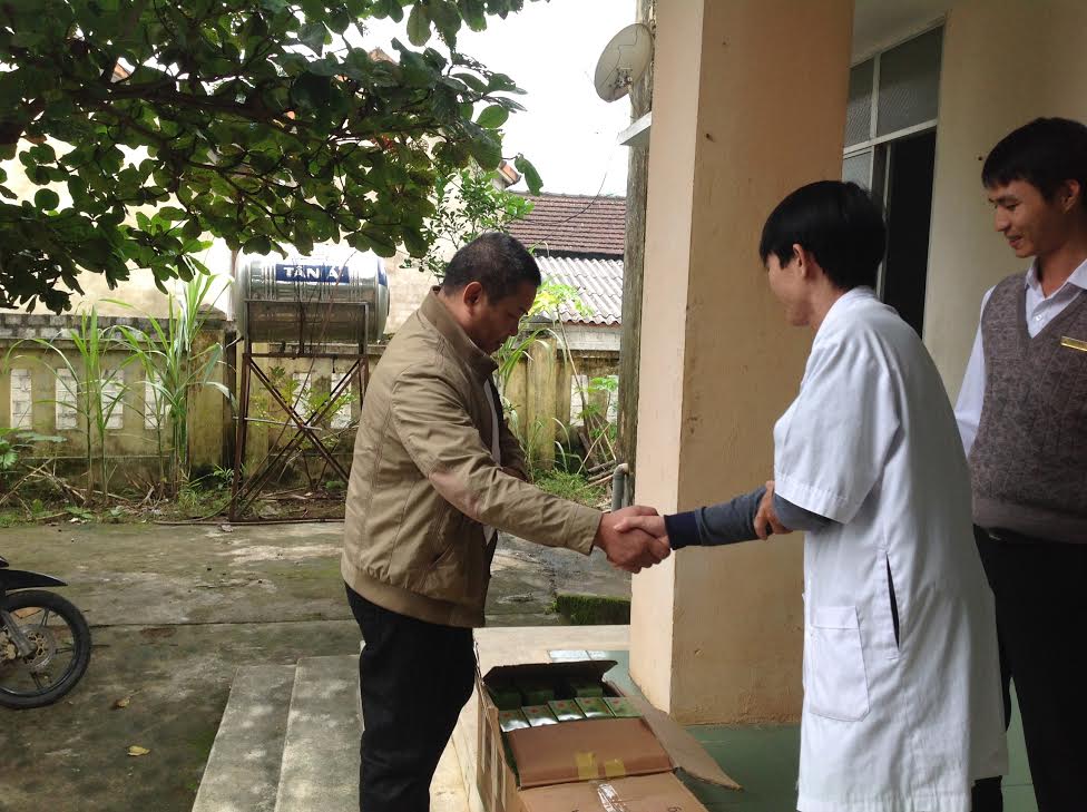Ông Phan Thế Kiên – Đại diện đoàn trao thuốc cho Trạm trưởng y tế xã.