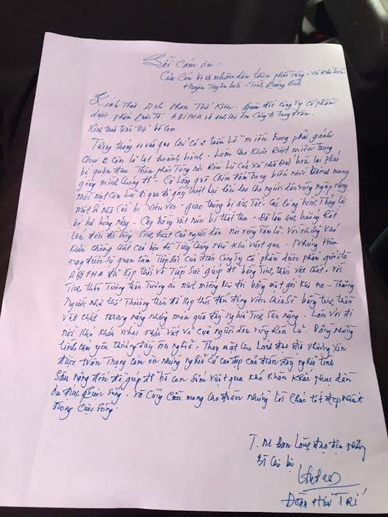 Thư cảm ơn của ông Đoàn Hữu Trí- Bí thư chi bộ xã