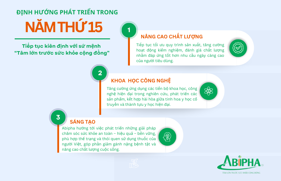 Bước vào giai đoạn phát triển mới, Dược phẩm Quốc tế Abipha xác định chiến lược trọng tâm là đầu tư đồng bộ cho hệ thống sản xuất, kiểm soát chất lượng và nguồn nhân lực. Với Abipha, công nghệ và con người chính là hai trụ cột cốt lõi để tạo nên những sản phẩm an toàn – chất lượng – ổn định. Dược phẩm Quốc tế Abipha cam kết sẽ tiếp tục: